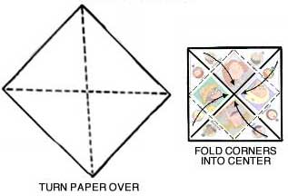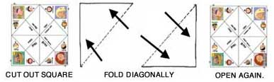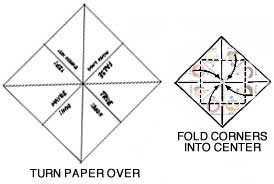 1. After you print out the fortune teller, cut it along the sides so that you have a square-shape. Fold the color side down on both diagonals (see diagram). Then unfold.