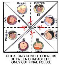 4. Use your scissors to cut the spaces between each character's flap. BE CAREFUL! Only cut the character's flap! If you cut thru the entire block, the Fortune Teller won't work! This step allows you to lift up each character separately to see the answers under each one.